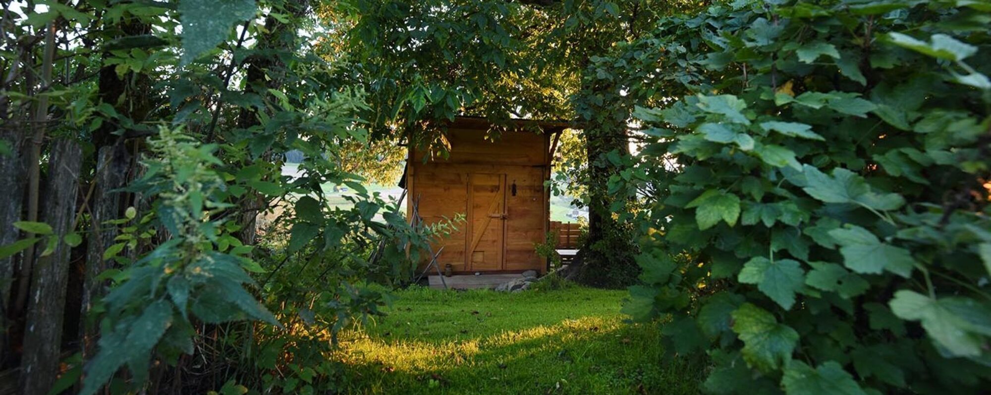 Das Dampfbad unter dem hundertjährigen Nussbaum mit Sicht auf die Alpen ist Schutz- und Freiraum, Ort der Aussicht und Einkehr. Darin verbinden sich die Grundelemente Erde, Wasser, Luft und Feuer.