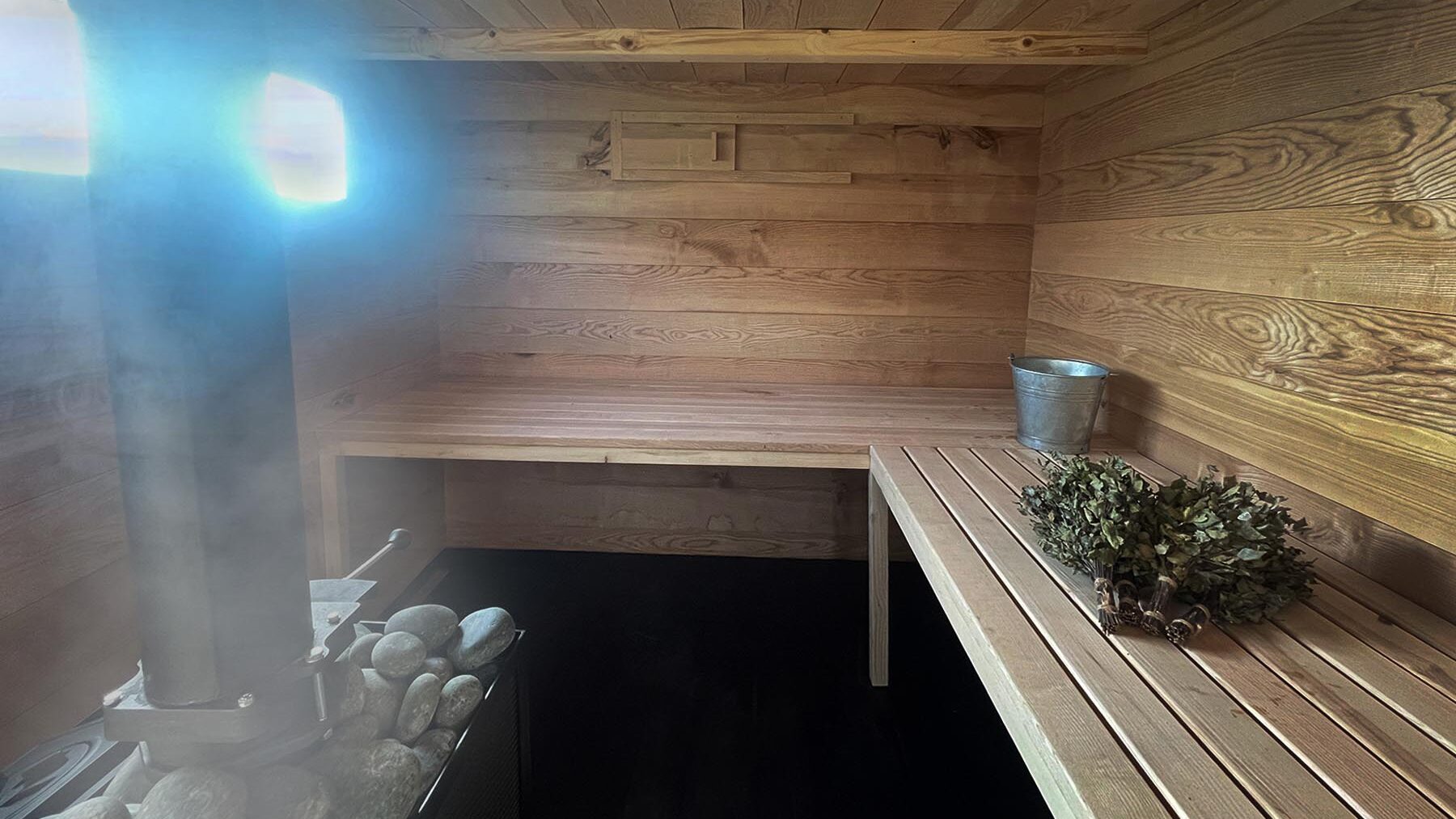 Das Dampfbad ist aus einheimischer Esche gebaut. Das Herzstück ist der holzbeheizte, gusseiserne Ofen aus Litauen mit 200 Kg Steinen, er erzeugt einen ganz besonderen Dampf. Die Luftfeuchtigkeit liegt bei 60 bis 100%, die Temperatur bei rund 60 Grad.